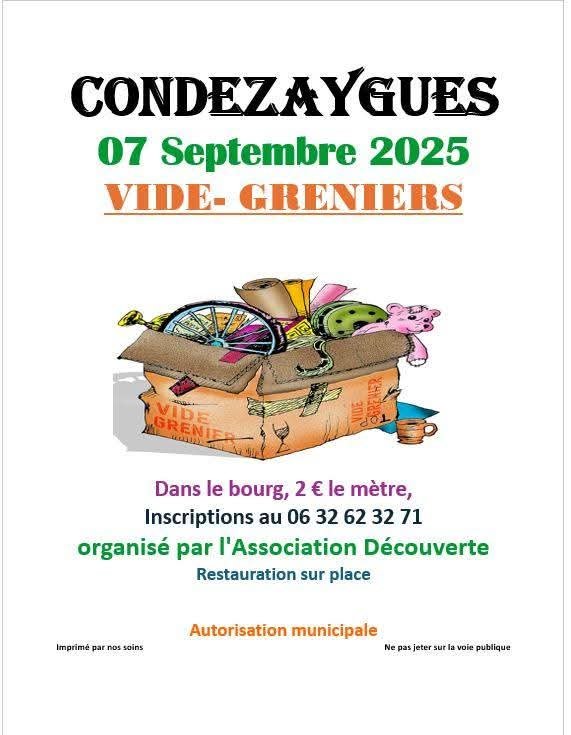Dimanche 7 septembre 2025, l’association DÉCOUVERTE organise un vide-greniers dans le Bourg de CONDEZAYGUES.