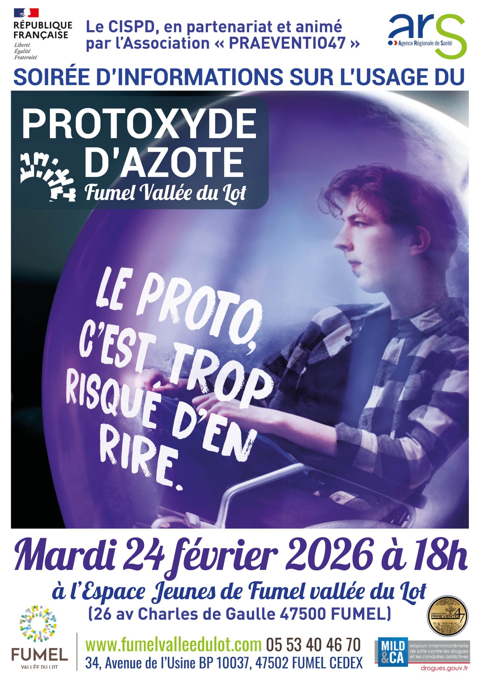 Le service CISPD de la Communauté de communes Fumel Vallée du Lot organise une soirée d’information et de sensibilisation sur l’usage du protoxyde d’azote, à destination des parents, des adolescents et des professionnels de santé.